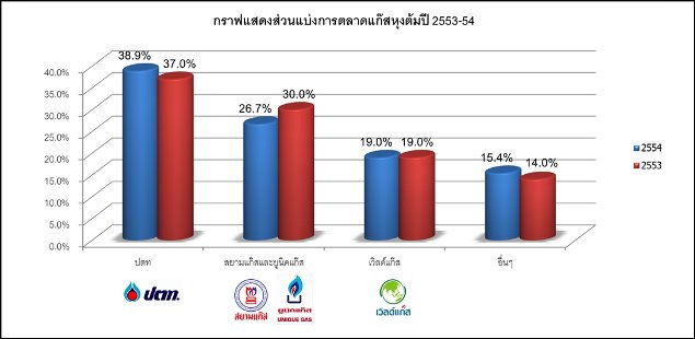 ในปัจจุบันมีผู้ผลิตและผู้นำเข้าแก๊สหุงต้มอยู่ประมาณ 4 รายใหญ่ๆ ซึ่งในปี 2554 ประเทศไทยใช้แก๊สหุงต้มประมาณ 6.89 ล้านตัน คิดเป็นมูลค่าการตลาดคือ 1.25 แสนล้านบาท โดยที่ บริษัท ปตท.จำกัด (มหาชน) เจ้าของแบรนด์ ปตท ครองส่วนแบ่งการตลาดสูงสุดที่ร้อยละ 38.9 โดยมีส่วนแบ่งเพิ่มขึ้นประมาณ 1.9% YoY รองลงมาคือ บริษัท สยามแก๊ส แอนด์ ปิโตรเคมิคัลส์ จำกัด (มหาชน) เจ้าของแบรนด์ สยามแก๊ส และ บริษัท ยูนิคแก๊ส แอนด์ ปิโตรเคมิคัลส์ จำกัด (มหาชน) เจ้าของแบรนด์ ยูนิคแก๊ส ครองส่วนแบ่งการตลาดรวมกันที่ร้อยละ 26.7 โดยมีส่วนแบ่งลดลงประมาณ 3.3 % YoY ถัดมาคือ บริษัท เวิลด์แก๊ส (ประเทศไทย) จำกัด เจ้าของแบรนด์ เวิลด์แก๊ส ครองส่วนแบ่งการตลาดเท่าเดิมที่ร้อยละ 19.0 ที่เหลือเป็นบริษัทอื่นๆ รวมกันที่ร้อยละ 15.4 โดยมีส่วนแบ่งเพิ่มขึ้นประมาณ 1.4% YoY