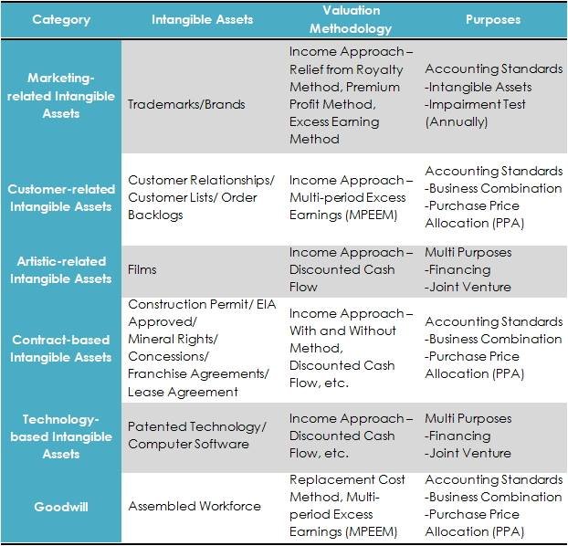 เรามีความชำนาญพิเศษในการประเมินมูลค่ายุติธรรมทรัพย์สินไม่มีตัวตน (Intangible Assets, IAs) โดยแยกตามกลุ่มต่างๆ (Category) พร้อมตัวอย่าง IAs วิธีการประเมินมูลค่า (Valuation Methodology) และ เพื่อวัตถุประสงค์ใดบ้าง ดังนี้
